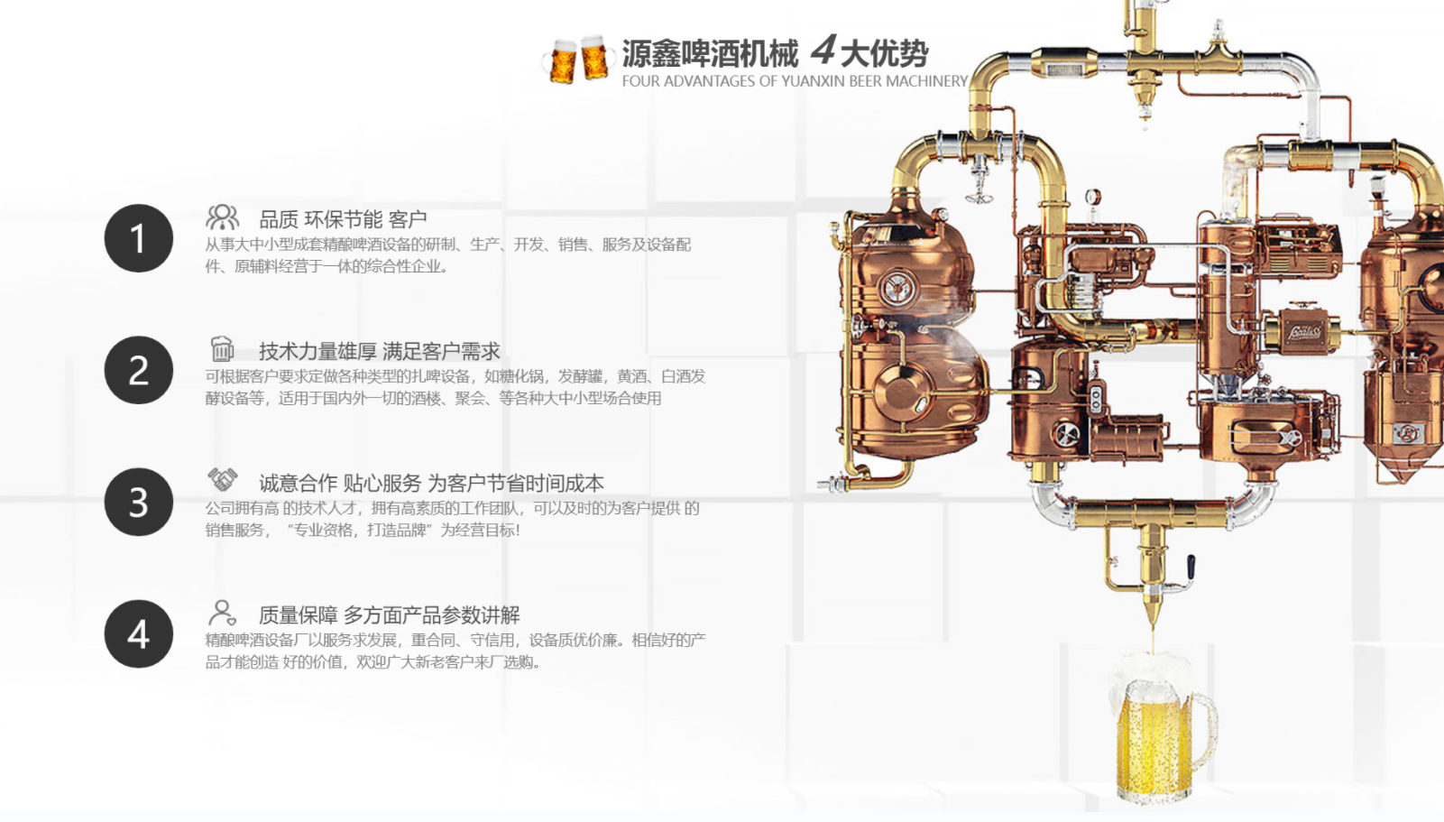 南陽市源鑫啤酒機(jī)械設(shè)備有限公司位于歷史文化名城一-南陽,從事大中小型成套啤酒、白酒自釀設(shè)備的研制、生產(chǎn)、開發(fā)、銷售、服務(wù)及設(shè)備配件、原輔料經(jīng)營于一體的綜合性企業(yè)。公司可根據(jù)客戶要求定做各種類型的扎啤設(shè)備,如糖化鍋,發(fā)酵罐,黃酒、白酒發(fā)酵設(shè)備等,適用于國內(nèi)外一切的酒樓、餐廳、家庭.聚會、酒吧等各種大、中、小型場合使用。公司擁有技術(shù)人才,擁有高素質(zhì)的工作團(tuán)隊,可以及時的為客戶提供**的銷售服務(wù)。公司以“專業(yè)資格,打造品牌”為經(jīng)營目標(biāo),“卓越質(zhì)量,信賴價格”為經(jīng)營宗旨,以質(zhì)量求生存,以服務(wù)求發(fā)展,重合同、守信用,設(shè)備質(zhì)優(yōu)價廉。相信好的產(chǎn)品才能創(chuàng)造 好的價值,歡迎廣大新老客戶來廠選購。...